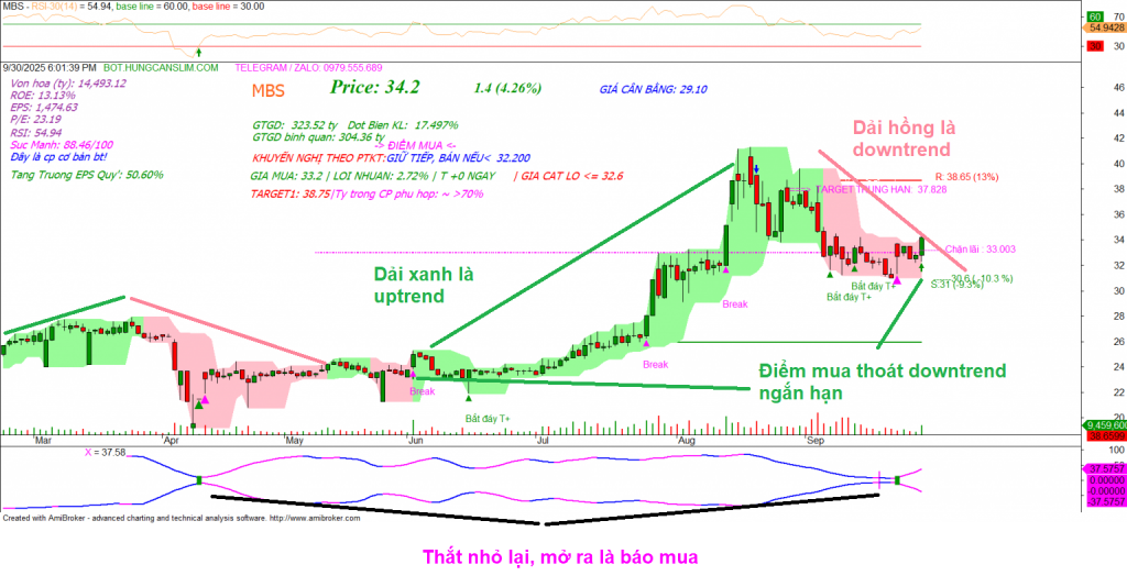 Cổ phiếu từ màu hồng chuyển qua xanh lá cây, thì là báo hiệu mua, kết thúc trend giảm, sẽ có mũi tên báo mua từ dưới lên